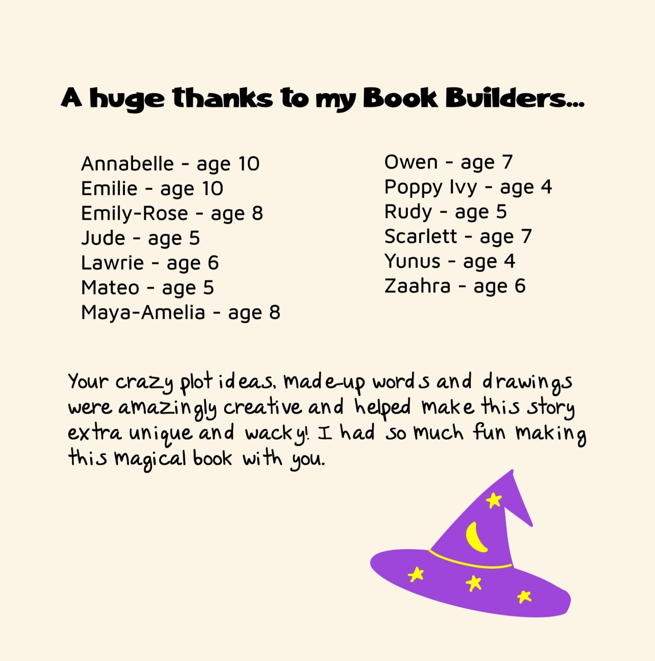Plot ideas, language and illustrations were inspired by a group of children aged 4-10, who helped create this book over summer 2025.